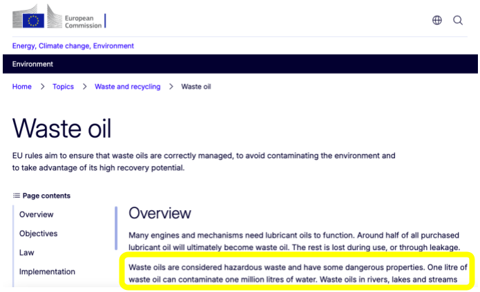 EUの公式サイトにも、”Waste oils are considered hazardous waste and have some dangerous properties. One litre of waste oil can contaminate one million litres of water.”(1リットルの油が約100万リットルの水を汚染するとされ、環境への影響は深刻です)と記載されています。