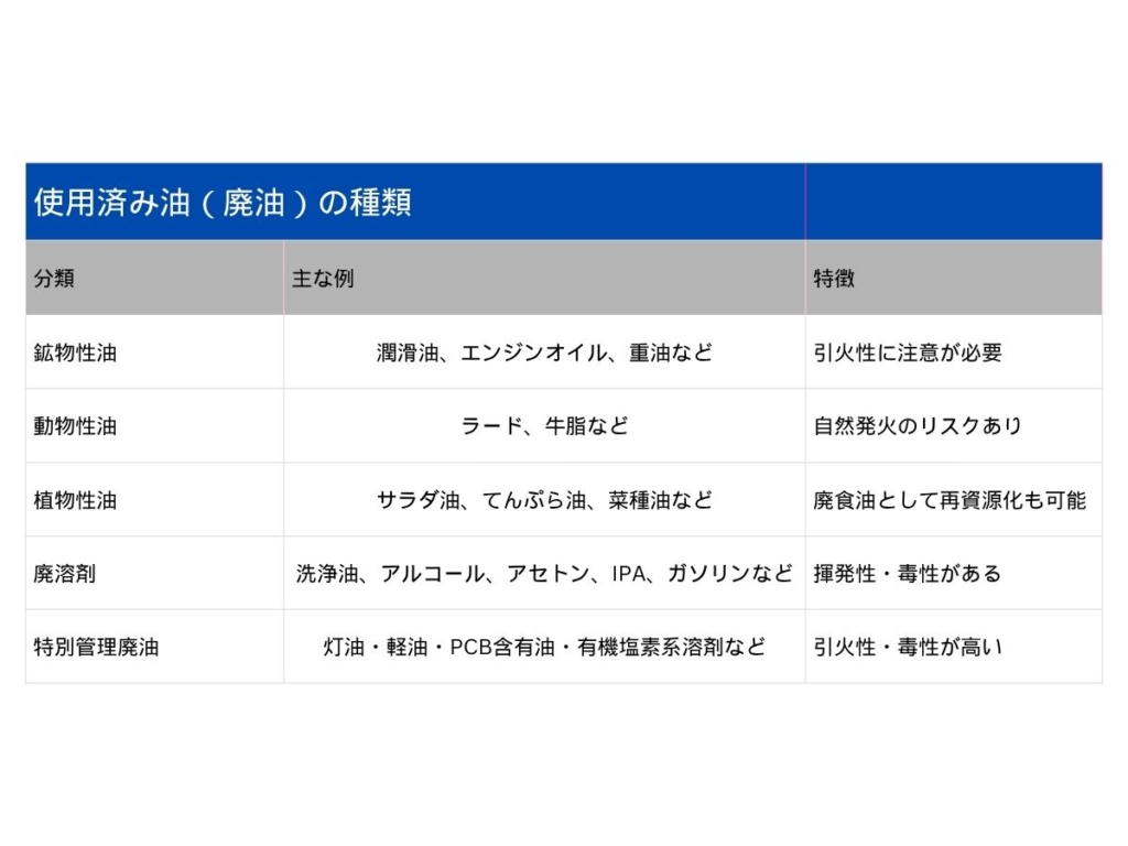 工場で発生する使用済み油は、環境保全と法令遵守の観点から、適切な分類・保管・処分が欠かせません。